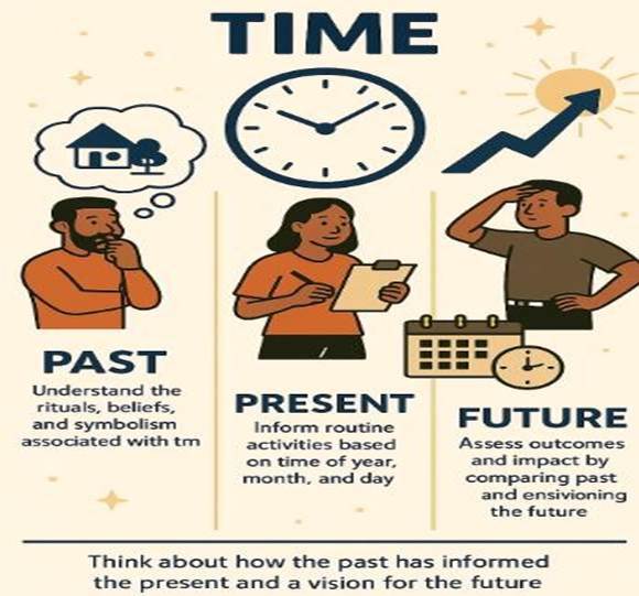 Time means looking back to the past, engaging in the present, and looking forward to the future. The success of project/intervention activities is measured against observed time patterns. Time focuses on understanding the rituals, beliefs, and symbolism associated with time and project activities, and thinking about how the past has informed the present and a vision for the future. The time of year, month, and day can inform routine activities, ultimately informing project outcomes and impact, which are assessed by comparing the past with the present and envisioning the future. Aligned with relationality and connectedness, success is measured at the individual, family, community, and systems levels. Themes to be explored include: