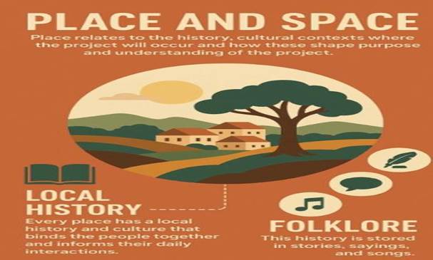 Place refers to the history and cultural contexts in which the project will occur and how they shape the project’s purpose and understanding. Every place has a local history and culture that bind people together and inform their daily interactions. This history is preserved in folklore: stories, sayings, and songs. Space refers to beliefs about the physical environment of project activities, which may have a positive or negative impact on the project. People have connections to their land and space, and there may be areas where it would be against community practice to site a project.