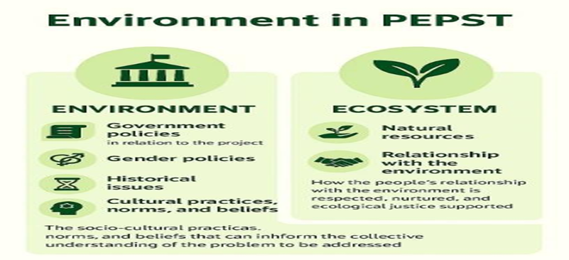 The PEPST Context Responsive framework is an African-rooted, people and context-centred evaluation tool that promotes a holistic approach to contextualising project/intervention planning and evaluation, moving evaluation towards systems thinking and building futures. Context is the interconnectedness and relationships among people and the environment. The value of collective responsibility and the co-creation of knowledge through interactions in a spiritual world is central to the meaning of context. Spirituality refers to the worldview that the living and the non-living, that is, the human beings and all nature, are related. The people must respect and nurture the environment. The concepts of environmental justice and environmental responsibility are drawn from this worldview.